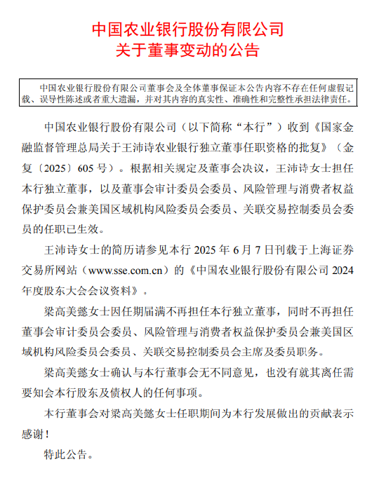 10月28日金融一线消息配资平台排名一览表,农业银行公告称,公司收到《国家金融监督管理总局关于王沛诗农业银行独立董事任职资格的批复》(金复〔2025〕605 号)。根据相关规定及董事会决议,王沛诗女士担任本行独立董事,以及董事会审计委员会委员、风险管理与消费者权益保护委员会兼美国区域机构风险委员会委员、关联交易控制委员会委员的任职已生效。
